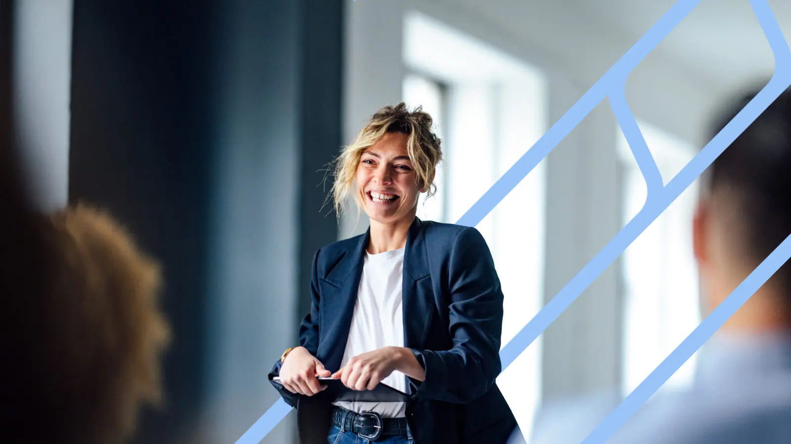 Lachende medewerker die uitnodigt om contact op te nemen